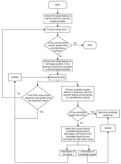 We show the algorithm architecture of this paper in Figure 1. The architecture consists of two modules: (1) the base tracking module and (2) the target location module. In the base tracking module, we input the image of the current frame and the target template into the correlation filter to calculate the response score map. In the target localization module, we introduce a multi-matching strategy to localize the target according to the response score map. We can describe the detailed process as follows: (1) Extract candidate targets according to the response score map. (2) Perform feature enhancement on candidate targets to generate feature descriptors. (3) Calculate the matching scores between the feature descriptors of the candidate targets in the current frame and those in the candidate set created in previous frames. (4) Maximize the total matching score to find the optimal match, and we take the position of the candidate matched with the target in the optimal match as the target position.