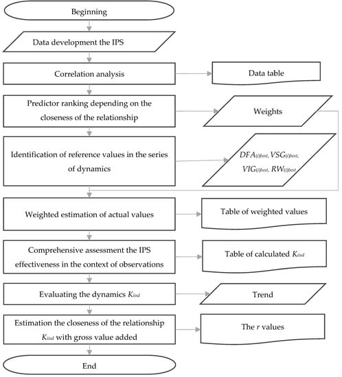 Based on the identified relationships between the criteria variables and predictors the author’s methodology for assessing the effectiveness of innovative industrial systems (IIS) is proposed. Our approach is based on the method of rating assessments and benchmarks and focused on a comprehensive assessment of the development of an innovative industrial system. For this purpose, the index which takes into consideration the correlation of predictors with the gross added value created by a separate sector of the economy—the growth of the innovative industrial system coefficient (Kiisd) is developed. It takes into consideration the criteria of technical modernization, development, innovation activity, and ecologization and reflects the complex efficiency of industrial system functioning. The algorithm of the methodology (Figure 1) clearly reflects the stages and the arrays of necessary data formed at each stage.