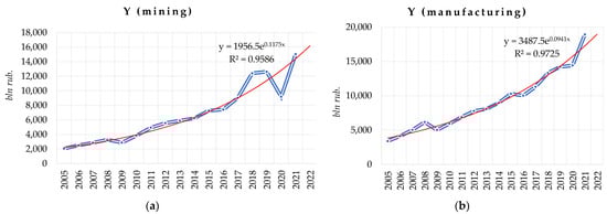 Extrapolation of gross value added by industrial sector of the Russian economy by constructing an exponential trend line for the mining (a) and manufacturing (b) industries.