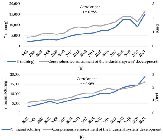 As in the case of gross value added, the coefficient of integrated development of industrial systems as a whole, increases (in both cases). The quality of the proposed indicator is confirmed by the comparison with the size of the gross value added. The higher quality of the indicator is demonstrated by the mining sector, as evidenced by low deviations and a correlation coefficient of 0.988 (Figure 4a). The deviations are more pronounced in the manufacturing industrial systems sector, as evidenced by the correlation coefficient of 0.969 (Figure 4b).