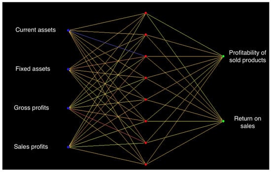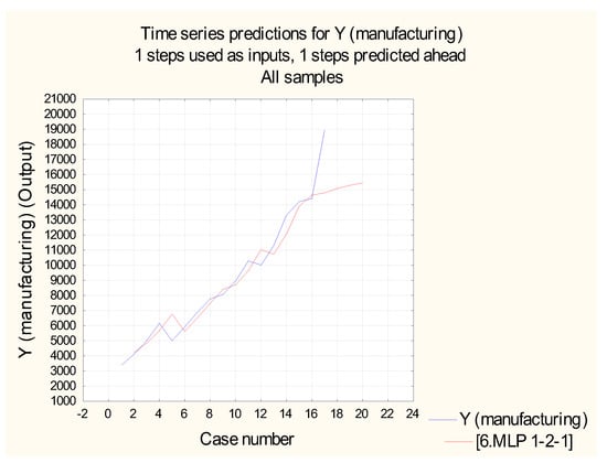 One of the purposes of the neural network technique is forecasting. A one-dimensional GDP prediction model was proposed by Longo et al. [34]. The problems of forecasting the regional industrial systems, where the authors proposed a neural network model with two blocks of input data (block 1—regional system and regional GDP level; block 2—panel data network and indicators of regional GDP growth index, mining, manufacturing and service sector growth values), and output parameters—forecasted values of industrial growth are disclosed in the works of Tuo et al. [35]. A predictive neural network model was proposed by Zhao and Niu [36]. The authors investigated the dependence of CO2 emissions on four factors—population, GDP per capita, standard coal consumption and the share of thermal power generation. Adesanya et al. use neural networks to predict process parameters in the thermoplastic extrusion process in the cable industry, whereby the authors set nine neurons (parameters describing physical material properties) as the input and 11 neurons (temperature parameters) as the output layer [37].