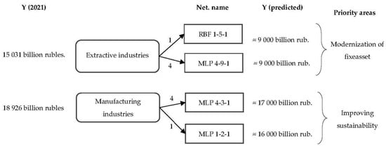 At the same time, the literature review of scientific positions allows us to judge the presence of a certain unrealized potential in the methodology of industrial systems efficiency management: there are no methodological solutions based on the training of artificial neural networks, allowing us to evaluate and predict the direction of industrial development, considering a complex of factors—innovation, environmental friendliness, modernization and production growth. An interesting approach to regional industry management based on neural networks was found in [35], but the authors limited the study to the inclusion of GDP and production index indicators. The above determines the relevance and importance of the development of predictive models and directions of development of both macro- and micro-industrial systems with the use of intelligent data processing tools.