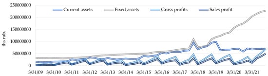 The algorithm of this study is built on the principle of decomposition at the macro- and micro levels of management of industrial systems. In the first case, we are talking about the industrial sector of the Russian economy, represented mainly by extractive and manufacturing industries. The array of data for diagnostics and forecasting of the development of industrial systems (in retrospect) covers the period from 2005 to 2021—the period of structural transformation of industry in Russia [1,46]. In addition, speaking of innovative industrial systems, we refer not only to the output of innovative products but also to the investment of resources in improving the environmental friendliness of production. In the second case—at the micro level—the object of the research was a Russian industrial petrochemical enterprise PJSC «Nizhnekamskneftekhim»; the initial data set represented by the time series for 2009–2021 (quarterly data). The choice in favor of this enterprise is due to its strategic importance since it is one of the largest petrochemical enterprises in Russia and in Europe, one of the largest producers of synthetic polyisoprene in the world and the third largest supplier of butyl rubbers in the world.