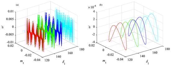 where and are generator rotor angle relative deviation, generator speed relative deviation, turbine mechanical torque relative deviation, and guide vane relative deviation, respectively. In addition, , and are generator mechanical time constant, generator damping constant, generator transient voltage of d’s axis, generator voltage of infinite bus system, generator transient direct axis reactance, generator quadrature axis reactance, partial derivatives of turbine flow with respect to water head, water starting time, partial derivative of turbine torque with respect to turbine guide vane, and major servo motor response time, respectively. Moreover, is defined as , where is partial derivatives of turbine flow with respect to guide vane, is the partial derivative of turbine torque with respect to turbine water head, and are partial derivatives of turbine flow with respect to turbine water head. Finally, ,,, and are the perturbation of the HTGS part, and is the output of the controller. Figure 1 depicts the phase diagrams of the HTGS for different initial conditions. The parameters of the HTGS have been considered as ; ; ; ; ; ; ; ; ; ; ; . Figure 1a illustrates the phase diagrams of the system of t ∈ [0, 350], while Figure 1b depicts the phase diagrams of ∈ [350, 500].
