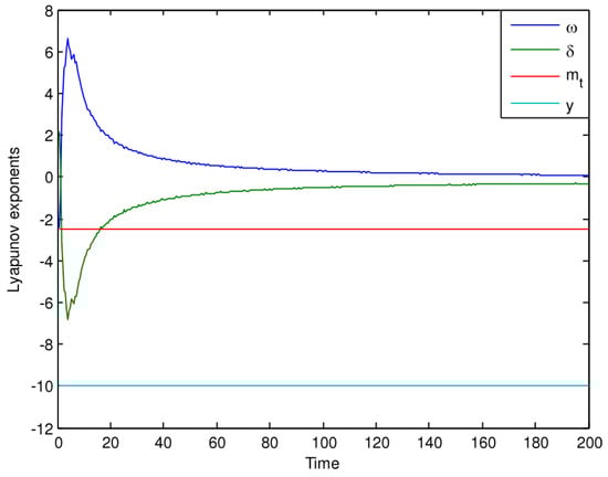 The red color curves are obtained with initial conditions of [δ1(t0), ω(t0), mt(t0), y(t)] = [1, 0.10, 0.10, 0.10], the green color curves are obtained with initial conditions of [δ1(t0), ω(t0), mt(t0), y(t)] = [20, 0.10, 0.10, 0.10], the blue color curves are obtained with initial conditions of , and the cyan color curves are obtained with initial conditions of = [40, 0.10, 0.10, 0.10]. As a matter of fact, the transient chaos is found in the system, which means that the system is chaotic at the beginning and becomes periodic finally. Moreover, Figure 2 shows the Lyapunov exponent spectrum of the system with respect to time. The maximum Lyapunov exponent is positive, which confirms that the given system will show chaotic behavior.