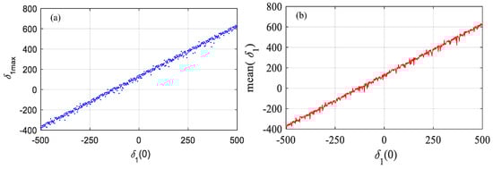Using the same parameters as above, a bifurcation diagram of the system with the variation of is shown in Figure 3a, and the mean value of is given in Figure 3b. Here, varies from −500 to 500 with a step size of four. It is shown in Figure 3 that the value of variable δ1 increases with the increase of on the whole. The position of attractors is changed with the initial conditions. According to reference [32], this phenomenon satisfies the concept of offset boosting. Thus, multi-stability is found in the system.