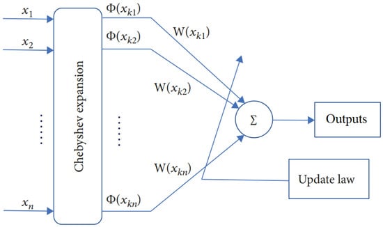 In this section, ChNN’s structure is described. ChNN is one type of neural network which uses Chebyshev polynomials [33]. Figure 4 shows the structure of a single-layer ChNN with two input blocks, an expansion block which is based on Chebyshev polynomials. The output of this ChNN is going to be an approximation of the model uncertainties of the system, and it is implemented in the proposed control method in this study. The neural network architecture is divided into two parts; the first part is numerical transformation, and the second part is learning algorithms that are used to find the best values of the network weights. By considering inputs of ChNN as and , which, respectively, are error and its time derivative, Chebyshev polynomials can be calculated using the following well-known recursive formula: