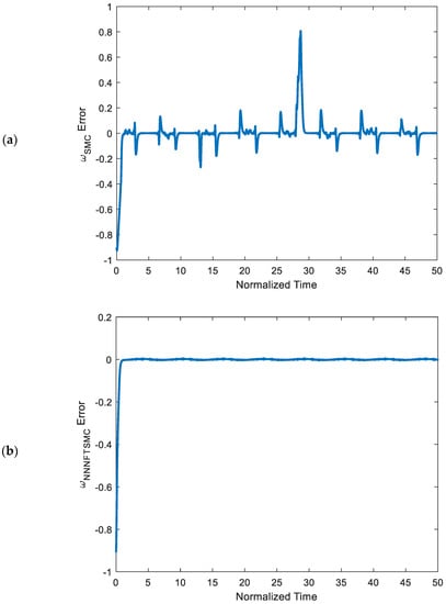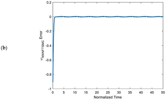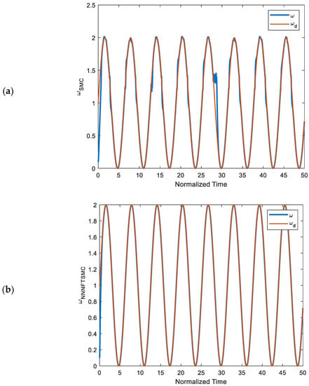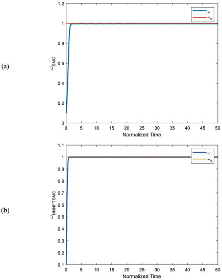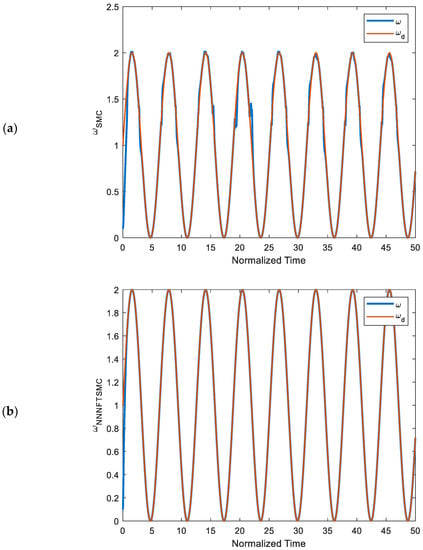 Herein, the proposed ChNN-based non-singular FTSMC was applied to the hydraulic generator regulating the system to control the orbit of generator speed relative deviation . The simulations were conducted in MATLAB 2020a [35] environment. Furthermore, the sliding mode controller developed by [36] was applied to the HTGS. The simulation results of both controllers are compared to show the effectiveness of the proposed controller over SMC developed by [36]. For all simulations, the dimensionless equations were used. Consequently, all variables are dimensionless. Without loss of generality, disturbance in the HTGS Equation (1) has been considered as . The initial values of the HTGS Equation (1) are chosen as . The performance of the presented controller has been evaluated in following cases.