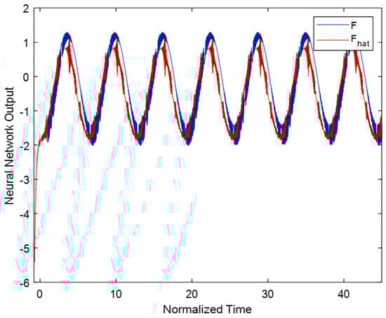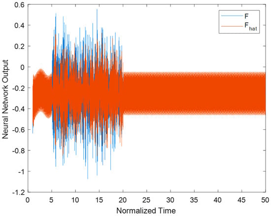 Additionally, to investigate the performance of the neural network estimator, its results for both cases are shown in Figure 10 and Figure 11. As it is observed in Figure 12, the ChNN approximates the function of the system. After t = 25, the estimated and actual values are approximately equal. In addition, for periodic input, the ChNN has a proper performance, resulting in more effective control results.