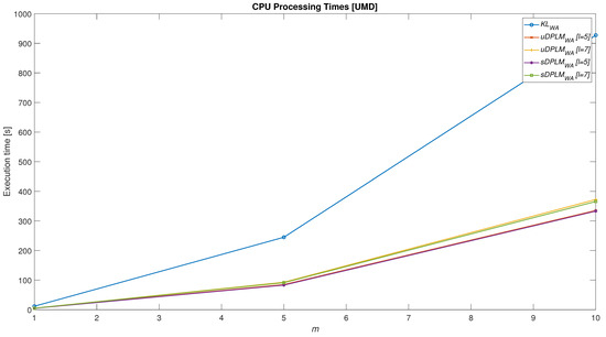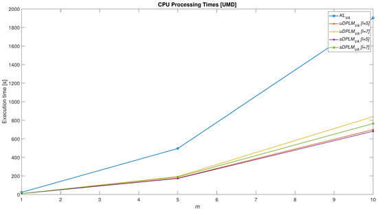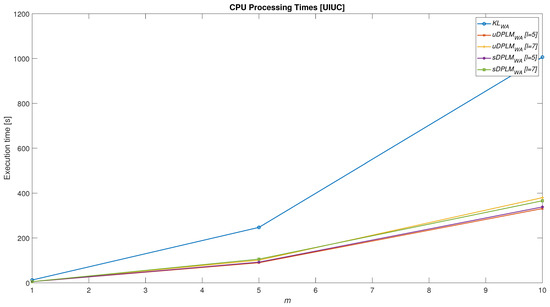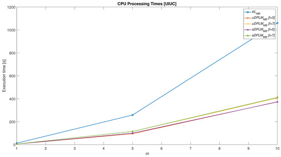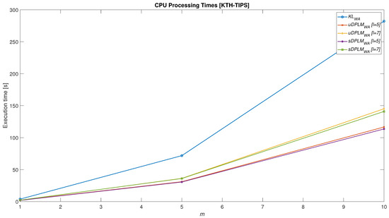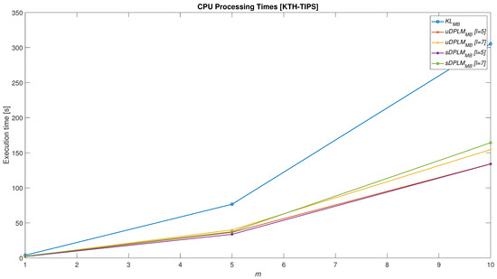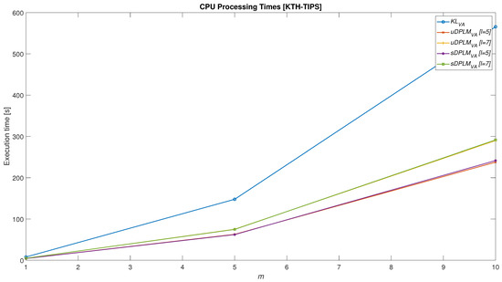 In Figure 2, Figure 3 and Figure 4, CPU processing times during the test phase are presented for the proposed DPLM-based and baseline KL-based algorithms ( vs. vs. , and vs. , for the UIUC database. Note that the CPU times include not only the given measures but the whole testing procedure, i.e., they also comprise the final voting, meaning that the results would otherwise be even more in favor of the proposed DPLM-based algorithms vs. the KL-based algorithms. In Figure 5, Figure 6 and Figure 7, the same results are presented for the experiments conducted using the KTH-TIPS database. The results of experiments conducted using the UMD database are presented in Figure 8, Figure 9 and Figure 10. It can be concluded that the proposed measures provide significantly lower CPU processing times in comparison to all baseline measures due to a significant reduction in the dimensionality of the original feature space.