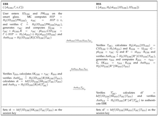 - The EBR user enters its and on the smart glass. MC verifies them, generates a random number and computes and and sends to BSS.