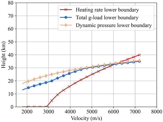 HGVs need to satisfy path constraints, terminal constraints, and control constraints. Constraining trajectories within reasonably constructed corridors is a way to deal with multiple constraints. Common corridors include height–velocity corridors, bank angle corridors, drag acceleration corridors, etc. In this study, a compound bank angle corridor is employed []. We substitute the atmospheric density Equation (3) and aerodynamic Equations (4) and (5) into the heating rate, overload, and dynamic pressure constraint Equations (7)–(9). Denoting , , as the height boundary of the maximum heating rate, overload, and dynamic pressure according to the speed v, as shown in Figure 1, the height constraint according to v can be obtained as