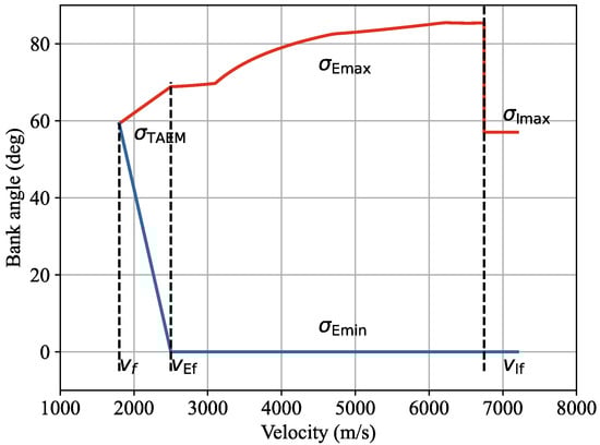 So far, we have obtained the upper and lower bounds of the bank angle corridor for the incoming HGVs to satisfy the path constraints. In the initial glide segment, due to the high flight altitude, the flight aerodynamic force is insufficient. In order to prevent the vehicle from falling too fast to generate a large amount of aerodynamic heat, the bank angle keeps a small constant value in the initial glide segment. In this paper, represents the maximum allowable bank angle amplitude during the initial glide segment. It is determined so that the heating rate in the initial glide segment is exactly equal to , that is, . The velocity at the end of the initial glide segment is expressed as the velocity corresponding to the maximum heating rate, denoted as .