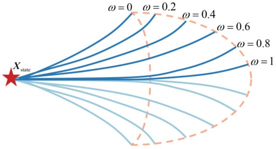 Different weighting coefficients can integrate different feasible trajectories. As shown in Figure 3, when traverses , all possible trajectories at the current state of the HGV can be generated, and the corresponding terminal points compose the footprint. The generation of a trajectory is inseparable from the long-term integration, and the long flight time of the HGVs and the large number of trajectories required to form the footprint lead to the exponential increase for computational burden, which makes it difficult to meet the real-time requirements of online footprint generation. Therefore, in the next section, we try to use DNNs to replace the traditional integrator to solve the problem in which the traditional footprint generation methods cannot meet the real-time performance.