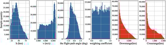 This subsection focuses on the generation of the dataset and the construction of the DNN. First, based on Section 2.3.2, reentry trajectories of different ranges can be obtained offline. The downrange and crossrange of the reentry flight is uniquely determined by the three flight states h, v, , and the weighting coefficient of the compound bank corridor. Different initial states and weighting coefficients are randomly selected to generate 10,000 trajectories, and 100 sample points are randomly selected from each trajectory. Specifically, the selection rules are shown in Table 1. Finally, a total of 1 million data samples are obtained, as shown in Figure 4, where the input are the flight states h, v, , and the weighting coefficients , and the output is the downrange and crossrange. The dataset is further divided into three sub-datasets, namely the training set, validation set, and test set, according to the ratio of 0.8:0.1:0.1. On this basis, Scikit-learn further normalizes the input and output of the dataset.