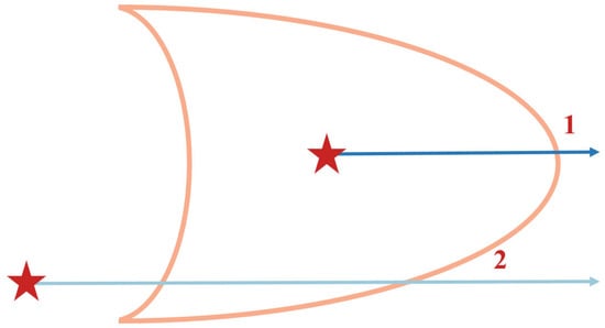 So far, as long as the current states are known, the latitude and longitude of the footprint can be calculated. After the footprint is known, it can be determined which targets are within the attack zone at the current moment. One simple way of finding whether a target is inside or outside the footprint is a ray casting algorithm []. As shown in Figure 7, one can draw a ray from this target and count the number of points at which the ray intersects the footprint. If the number is odd, the target is inside the footprint; otherwise, it is outside the footprint.