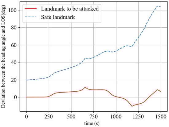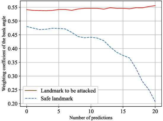 As shown by the red line in Figure 8, if the landmark is the attack target, the weighting coefficient inferred from the detected historical flight state to attack this landmark is almost unchanged. As shown by the blue line in Figure 8, if the landmark is not the target, the distance between the vehicle and the landmark is not always decreasing. The weighting coefficient inferred from the detected historical flight state to attack this landmark changes sharply.