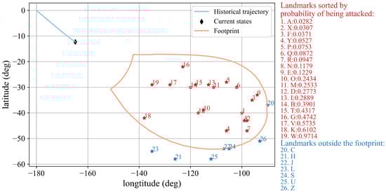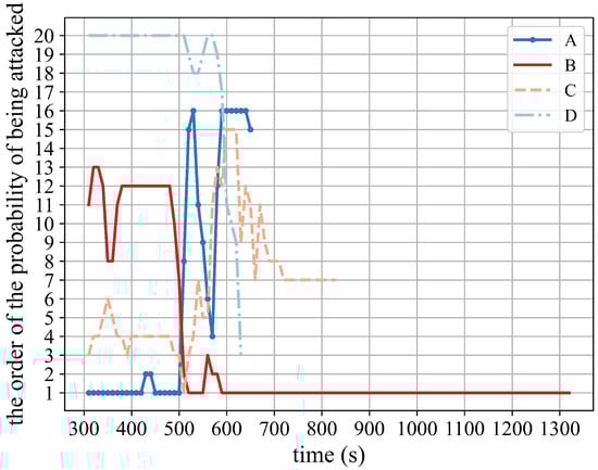 This section verifies the effectiveness of the forgetting mechanism by predicting the intention of a CAV that changes its attack target during the flight. Part of the information of the flying CAV is shown in Table 6. The vehicle originally intended to attack Landmark A at 100 W, 40 S, but changed its attack intention at 500 s to attack Landmark B at 120 W, 30 S. Of course, the above information and whether and when to change the attack target is unknown to the defender. Twenty-four landmarks C∼Z with longitude between [90 W, 140 W], latitude between [20 S, 60 S], and the importance weights I between are generated by random numbers. We set a landmark A with longitude of 100 W, latitude of 40 S, and importance I of 0, and set a landmark B with longitude of 120 W, latitude of 30 S, and importance I of 0. We set the weight of each intention inference criterion to , , , respectively. The decay rate of forgetting mechanism is set to 0.7. The probability of attacking these 26 landmarks is predicted and ranked in real time. The first prediction is at 290 s. The prediction interval is 10 s.