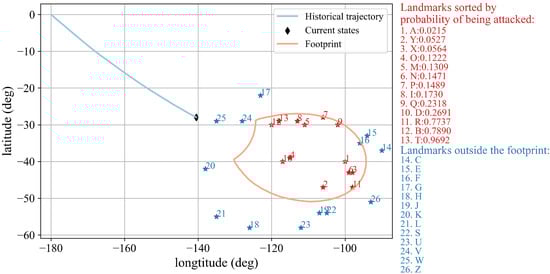 In this section, we turn our attention to demonstrating the effectiveness of the typical intention inference. Part of the information of the flying CAV is shown in Table 5. Of course, this information is unknown to the defender, and the defender can only detect the states of the CAV during the flight. Twenty-five landmarks B∼Z with longitude between [90 W, 140 W], latitude between [20 S, 60 S], and the importance weights I between are generated by random numbers. We set a landmark A with longitude of 100 W, latitude of 40 S, and importance I of 0. We set the weight of each intention inference criterion to , , , respectively. The probability of attacking these 26 landmarks is predicted and ranked in real time. The first jump of CAV was detected at 282 s. Due to the complex dynamic characteristics of the initial descent phase of HGV, intention inference was not performed in the initial glide segment. The first prediction is at 285 s. The prediction interval is 5 s.