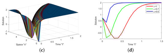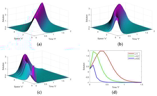 For Equation (26), (a–c) with parameters , , displays the 3D representations and (d) displays the 2D plot for various values of at ; there is no overlap between the curves of the solution. (a) (b) and (c) .