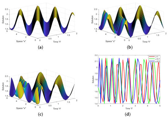 For Equation (21), (a–c) with parameters ,, displays the 3D representations and (d) displays the 2D plot for various values of at ; there is no overlap between the curves of the solution. (a) (b) and (c) .