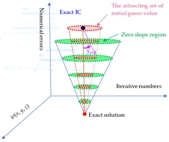 To avoid iterative procedures under the noisy effect, Liu and Atluri [] proposed a variable transformation, named the fictitious time integration method (FTIM), an extensive system of nonlinear algebraic equations. Liu [] applied the FTIM to solve two-dimensional quasilinear elliptic boundary value problems. Furthermore, Ku et al. [] modified the FTIM and considered a time-like function in the FTIM to increase the convergence rate. Later, Tsai et al. [] applied the F-Trefftz method to solve Poisson-type nonlinear PDEs, and the FTIM with a time-like function was used to solve the linear algebraic equations. However, the selection of the parameters is difficult, such as the viscosity-damping coefficient, the fictitious time step and the convergence criterion. Furthermore, Chang [] applied an FTIM for multi-dimensional backward heat conduction problems. Although these approaches seem to give a satisfactory result, there is a fatal problem with this method, which is the problem of multiple solutions. When the viscous damping coefficient, fictitious time step, convergence criteria and fictitious terminal time are not correctly selected, the FTIM will not converge and cause diverge. To avoid the numerical sensitivity problem of the initial guess value and parameter selection, some space-time variable transformations of methods, including the scalar-based homotopy method [], manifold-based exponentially convergent algorithm [], the residual-norm-based algorithm [] and the dynamic Jacobian-inverse free method [], have been proposed to avoid the actual sensitivity problem of the initial guess value. These approaches provide acceptable approximate results, but low convergence efficiency, and a large number of iterations are inevitable when considering strict convergence conditions or a large number of discrete grids.