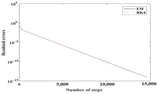 The domain is given by . Here, we set the parameters as and start from an initial guess value of . In comparison with the Euler method (EM) and RK4, the convergence plot is shown in Figure 2. The proposed scheme converges for RK4 within and the EM within iterations. The absolute errors for RK4 and the EM are plotted in Figure 3, and both schemes have the same maximum errors of . The absolute errors for RK4 and the EM are smaller than the values of in the proposed scheme and in the conventional FTIM by Liu []. As shown in Figure 1, the true solution depends on the initial guess value and . That is, using higher-order numerical integration methods cannot improve numerical accuracy.