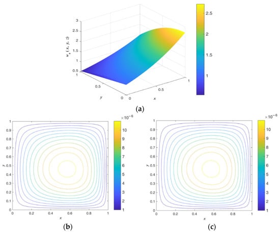 The contour of the initial guess value of is shown in Figure 9. The numerical result and absolute errors are shown in Figure 10. The present scheme by the EM converges within one step, and the maximum error of the numerical solution is smaller than .