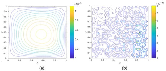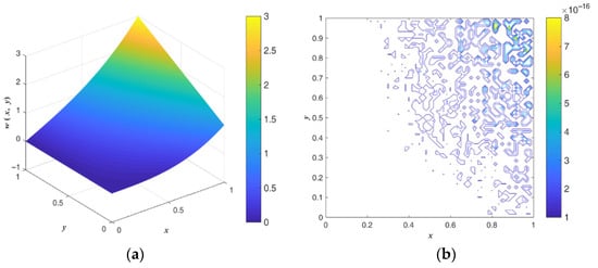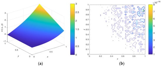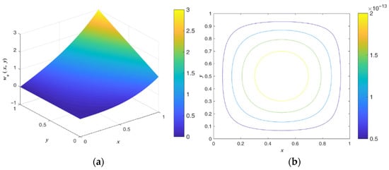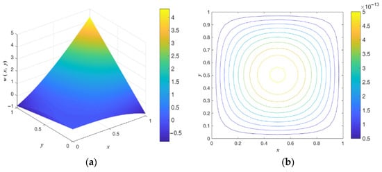 The BCs can be computed exactly by Equation (20). The parameters are set as follows: and starting from an initial value of according to Equation (15). The contour of the initial guess value of is shown in Figure 13. The results show that the residual errors are reduced to with iterations. The numerical results and absolute errors are plotted in Figure 14. The figure shows that the maximum error in the numerical solution is smaller than , which is better than that of Zhu et al. [] with and Liu and Atluri [] with . Because the initial guess value cannot be exactly obtained, numerical iteration is inevitable. The results show that the proposed method effectively and accurately solves nonlinear problems.