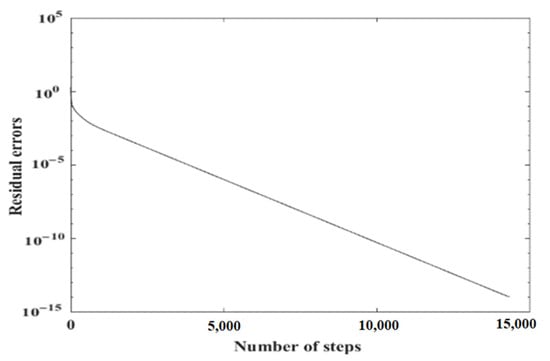 The domain is given by . Here, we set the parameters as and start from an initial guess value of . Figure 7 shows the convergence of residual errors, and the numerical result and absolute errors are shown in Figure 8. The present scheme by the EM converges within , being better than that established in Chen et al. [] by RK4, which converges within iterations. Figure 8b shows that the maximum error of the numerical solution is smaller than , which is better than the maximum error of achieved by Liu [] and the error of realized by Chen et al. []. Here, we find that the RK4 for the linear Poisson equation has the same order as the EM. That is, the initial guess value is the main reason for numerical accuracy when the convergence angle is small enough.