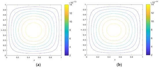 For Example 1: the contour of the absolute errors of and . (a) ; (b) .