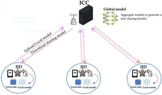 FL is a distributed machine learning model that trains local models on the user side and aggregates them with a central manager []. The large-scale distributed training of local data iteratively aggregates the data into a global model, which helps protect the privacy of the data []. FL keeps private data local and only shares the model parameters. FL allows devices to collaboratively train shared models without having to exchange their local private data [].
