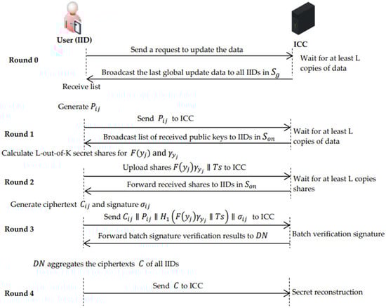 Inspired by this issue, Google proposed federated learning (FL), a cryptographic distributed machine learning technique for data privacy protection and model collaborative training []. FL trains high-quality AI models by averaging local model updates aggregated from many IIoT devices. It eliminates the need for direct access to local data, reducing the risk of privacy breaches. Because FL collects data from many IIoT devices to train the AI model, the training model accuracy is significantly improved, which is not possible when training centralized traditional machine learning algorithms with fewer data []. Inspired by these attractive features, research activities that combine FL and the IIoT have been carried out [,,]. However, these works only focused on some IIoT applications, but ignore IIoT privacy protection. In the federated learning model transmission process, there is also the risk of privacy information disclosure []. Therefore, it is challenging to design federated learning schemes that meet the privacy protection and information security requirements of the IIoT.