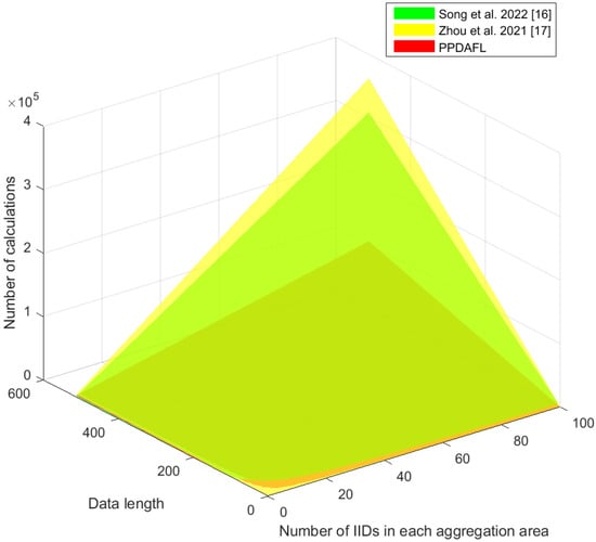 represents the number of IIDs in each aggregation area, and indicates the data length. As shown in Figure 4, the communication overhead of the scheme from [] is the highest, whereas that of the PPDAFL scheme is the lowest.