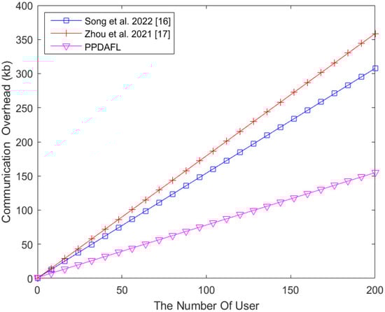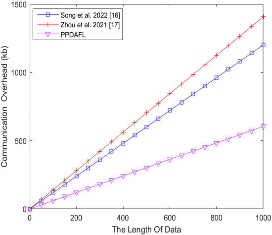 Figure 5 shows the communication comparison between PPDAFL and the schemes from [,] at = 256 bits. Figure 6 shows the comparison of the communication costs between PPDAFL and the schemes of [,] when = 200. As shown in Figure 5 and Figure 6, PPDAFL has a higher communication efficiency than the schemes of [,]. As the number of IIDs or the length of the data increases, PPDAFL saves more communication overhead.
