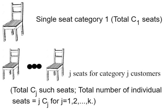 For category j customers, is the maximum capacity of their service room (in the vessel) where , whereas is the maximum capacity of their waiting room (in the transport station) where . Regarding the service rooms, the total number of individual seats is visualized in Figure 1 below.
