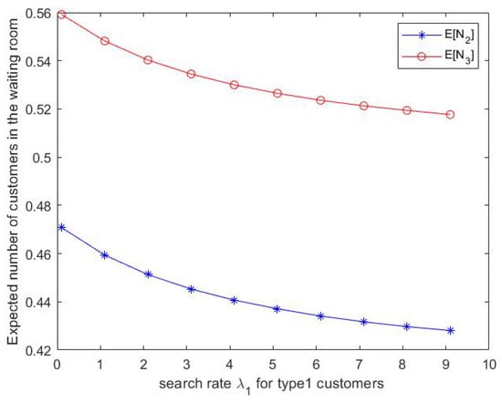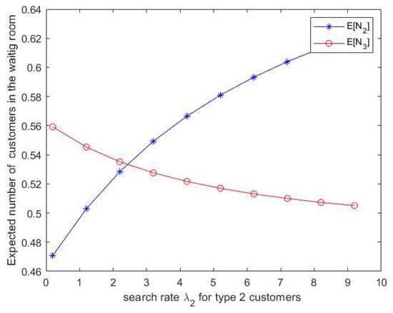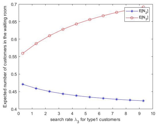 - We can notice from Figure 9 that the expected number of type 3 customers in the waiting room 3 decreases as increases. However, the expected number of type 2 customers in the waiting room 2 increases when increases.
