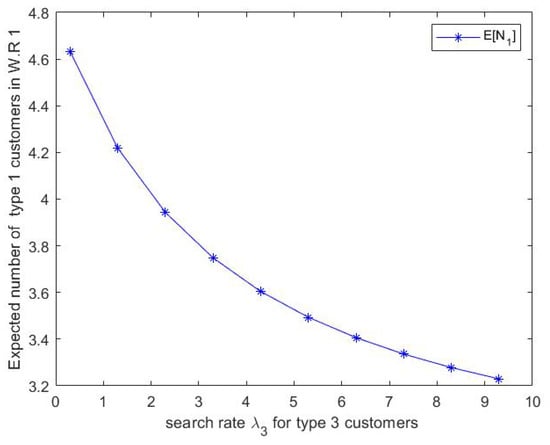 - We can notice from Figure 12 that the expected number of type 2 customers in waiting room 2 decreases as increases. However, the expected number of type 3 customers in waiting room 3 increases when increases.