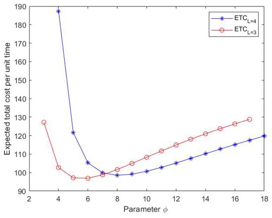 Then, we compute and when and , as mentioned in Table 7 and Table 9, respectively. From Table 6, Table 7, Table 8 and Table 9 and Figure 14, we can realize that the optimal value of the expected total cost per unit time is when and the optimal value of the expected total cost per unit time is when for these two examples.