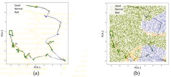 Figure 2. Scatter plots expressed in 2D through PCA: (a) training data and (b) random sampling added to (a).