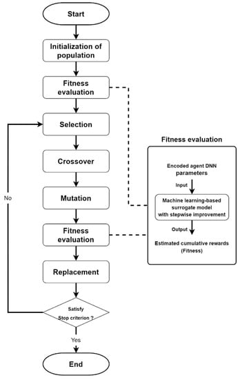 The flowchart of the proposed SGA is shown in Figure 3. GA operators designed in Section 3 optimize the encoded parameters of an agent DNN, and the fitness values of the chromosomes are evaluated by surrogate model with stepwise improvements of Section 3.1.4.