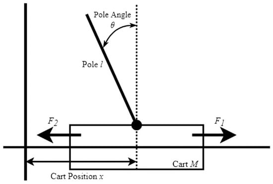 In this study, we experimented using cart-pole balancing, a classical continuous control environment that is mainly used as a benchmark in DRL and neuroevolution. Cart-pole balancing comprises a pole l attached through a pivot joint on cart M, as shown in Figure 4. It is a physical system that maintains the attached pole l in a vertical position by moving M in the left and right directions on a frictionless track. In this study, a simulation was performed using the CartPole-v1 environment of the OpenAI Gym toolkit. The state space in question comprised a 4D real number vector, constituting the position and velocity of M and the angle and angular velocity of l. The action space in question comprised a 2D discrete vector constituting the mechanism to push the cart left and right. The end conditions of the environment were as follows: (1) The position of cart M is outside ±2.4, (2) the angle of pole l is outside ±24, and (3) the step reward exceeds 500. When an end condition was not met, the agent received a reward of one for each time step. In this environment, the optimal solution for DNNs is to achieve a cumulative reward of 500 according to the maximum time step. Table 1 presents the environment characteristics of the cart-pole balancing experiment. Cart-pole balancing’s objective function as follows: