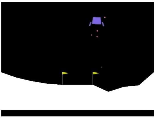The lunar lander is a classical rocket trajectory problem, wherein the trajectory of the landing craft must be adjusted to ensure that it lands on the landing pad without collision. As shown in Figure 5, the simulation was conducted using LunarLander-v2, a Gym OpenAI Box2D gaming environment. It is evident that the state and action spaces are more complicated than the cat-pole balancing environment, making the agent’s DNN more complex. The state space is an 8D mixed vector comprising the lander coordinates, speed, angle, angular speed, and ground attachment. The action space is a 4D discrete vector comprising do nothing, fire left orientation engine, fire right orientation engine, and fire main engine actions. The agent end condition was configured as follows: (1) the lander touches the ground, (2) the lander is out of the specified x range, and (3) the time step achieves 1000. If the lander reached the landing pad, the agent received a reward; if it moved away, the reward was lost. Additional rewards could be scored based on whether the leg of the lander was in contact with the ground. Finally, if the lander used an engine, the agent lost the reward. The threshold for solving the lunar lander problem was that the average reward of the simulation exceeded 200, which is evaluated as the optimal solution in this environment. The environment characteristics of the lunar lander problem is presented in Table 4. Lunar lander’s objective function as follows: