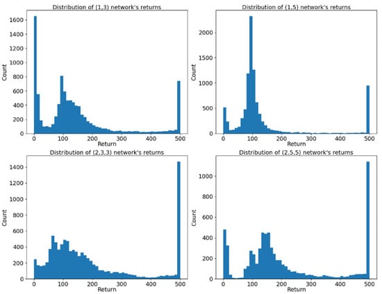 The cumulative reward distribution for each architecture case is shown in Figure 6. The experimental points that achieved the maximum cumulative reward of 500 were collected for all architecture cases. In the simplest case (1, 3), the solution quality was worst, and the most returns were lower than the decision threshold of 195 for the first classifier of the surrogate model described in the cart-pole balancing problem.