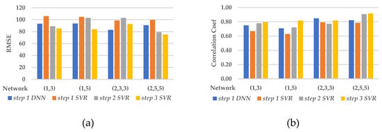 Performance for each architecture with stepwise improvement. (a) RMSE and (b) Pearson correlation coefficient.