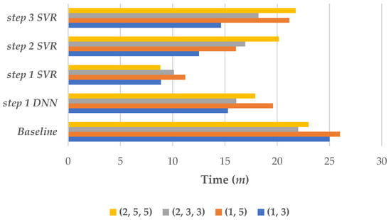 Table 5 lists the performance results of the proposed SGA for the cart-pole balancing problem according to the surrogate model and the network. It presents the fitness and simulation results of 30 runs. In addition, the hypothesis test results between simulation values according to the SGAs’ surrogate model are also shown. Since the simulation values of SGA are nonparametric and independent, the method of a hypothesis test is Mann–Whitney U; most fitness scores are overestimated compared to the simulation score. In Step 1, multiple surrogates were used, and the regressor was configured as DNN or SVR. When the DNN regressor was used, the maximum cumulative reward could not be determined in all the architecture cases. However, the agent DNN achieved a maximum cumulative reward of 500 in all cases except (1, 3) when the SVR regressor was used. This suggests that in the data distribution discussed in Section 4.1, the (1, 3) case achieved a low optimization performance because many solutions did not satisfy the decision boundary of the first classifier. The results obtained using the Step 2 surrogate model that applied input data standardization were enhanced for all architectures. In the (1, 5) network, the simulation scores of all runs were 500. The last step improved the results for all networks, and an optimum value of 500 was obtained by all runs in the (1, 5) network. The p-value is a significant probability, and it can be analyzed that the difference in variance between two samples is significant when p-value is less than 0.05. When the regressor was changed from DNN to SVR and improvement on Step 2 was applied, p-values was less than 0.5 except the (1, 3) case. Figure 8 shows the computing times of the proposed SGAs and the baseline DDQN for cart-pole balancing optimization. Through DDQN, which was used for collecting experimental points, the time required for searching the maximum cumulative reward was set to the baseline. Although the computing time of the SGAs increased when the stepwise improvement was applied, it is shown that the computing time was reduced in all architectures rather than in baseline. The computing time was reduced in all network experiments using the proposed SGAs, and in the best optimization (1, 5) it was reduced by approximately 38%.