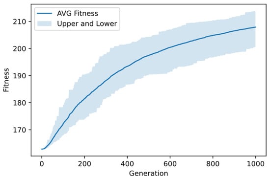 Like the environment of the cart-pole balancing, our SGAs in the Lunar lander also reduced computing time compared to the baseline. The baseline is the initial discovery time of the achievement of a problem via DDQN for collecting experimental points. The average computing time of 30 runs of our SGA was approximately 18 min and the calculation time of the baseline was 363 min, which was improved approximately 95% over the baseline. Among the 30 runs, 24 exceeded the problem-solving threshold, and the best-performing SGAs explored agent DNNs, which were approximately 4% better than the best solution of the training data of the surrogate (Table 6). Figure 9 shows the best individual average for each generation of the 30 runs.