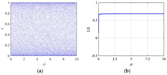 where is the value of the derivative of the mapping function at . N is an integer that is large enough. Figure 2a is the bifurcation diagram of the state quantity of system (1) changing with parameter μ. Figure 2b is the graph of the Lyapunov exponent of system (1) changing with parameter μ, where e is set to a fixed value of 0.0001.