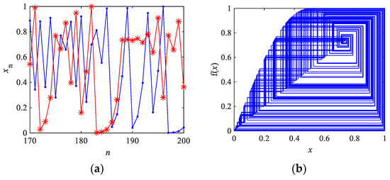 The time-series diagram and cobweb graph of system (1): (a) The time-series diagram, the blue dot data is generated from the initial value 0.23, and the red asterisk data is generated from the initial value 0.23 + 10−12; (b) the cobweb graph.