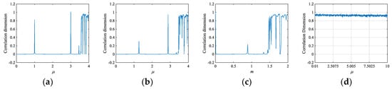 In this test, we use the toolbox function correlationDimension( ) in Matlab to calculate the correlation dimension of time series generated by system (1) with different parameters b; the results are presented in Figure 6. Figure 6 also shows the three comparable chaotic maps: the logistic map [26], the sine map [27], and the quadratic map [10]. As shown in Figure 6, system (1) shows chaotic behavior when μ > 1.063298753415842 × e. It can be seen that system (1) has higher maximum correlation dimension values with μ > 1.063298753415842 × e. Therefore, the phase space of the system (1) has a better chaotic performance than the three comparable maps.